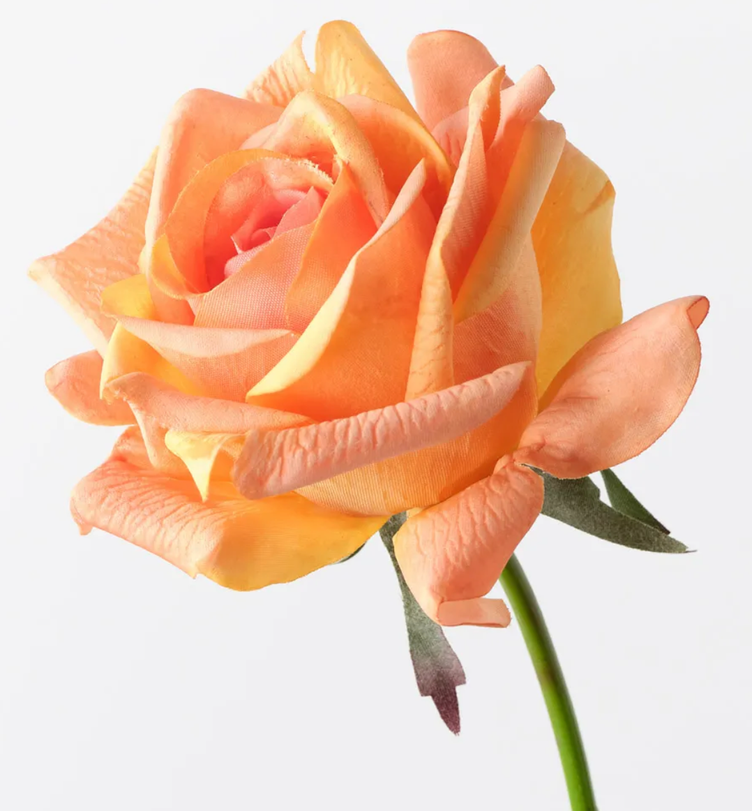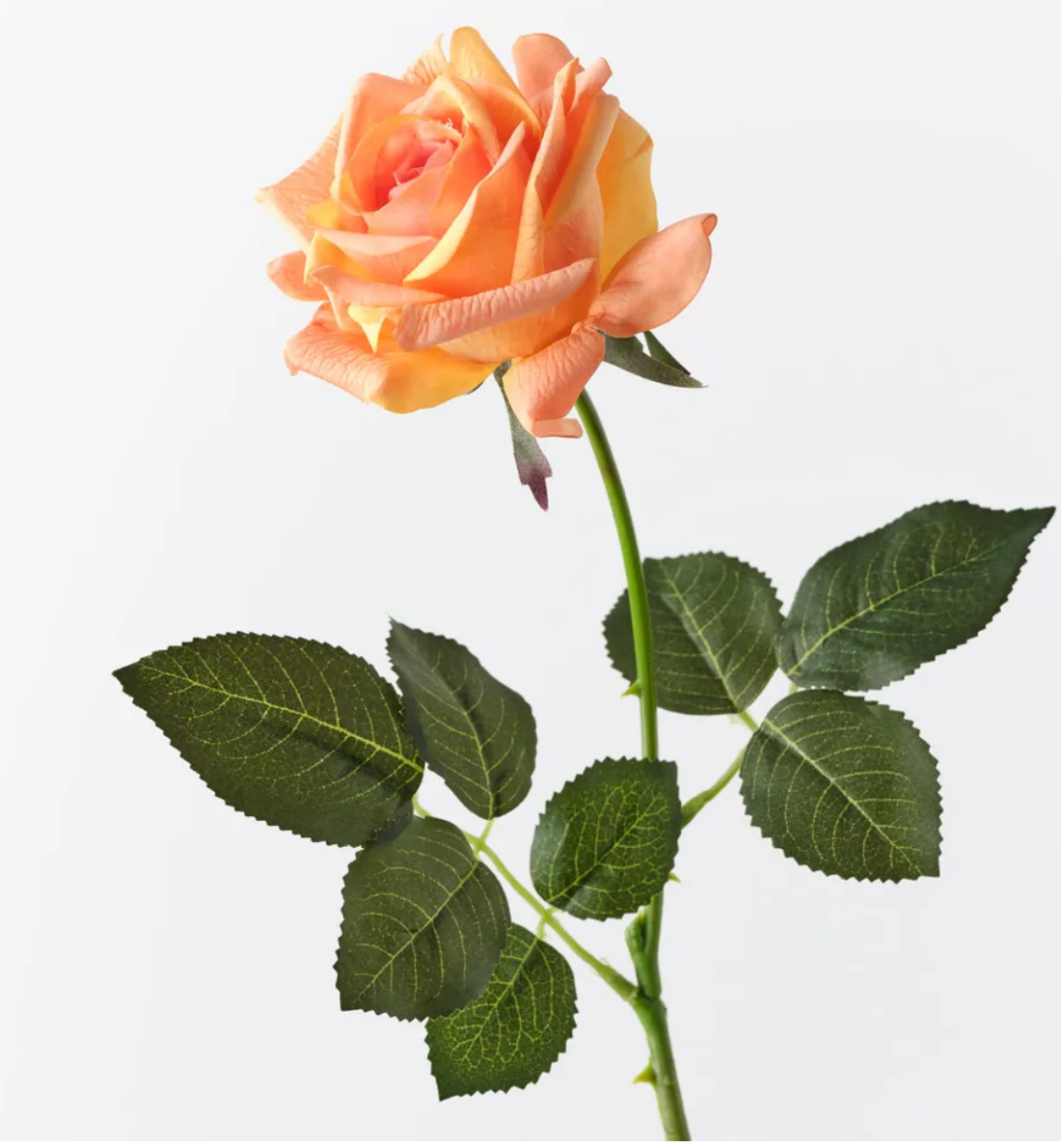 Introducing our real touch Kim Rose stem, featuring an elegantly open blossom surrounded by lush green foliage. This beautiful, lifelike rose showcases delicate petal layers. With its full, open head and sturdy stem, the Kim Rose is perfect for creating romantic bouquets or adding a classic floral accent to your decor that stays fresh and vibrant year-round.